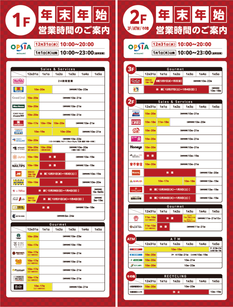 オプシアミスミ年末年始の営業時間をご案内いたします。