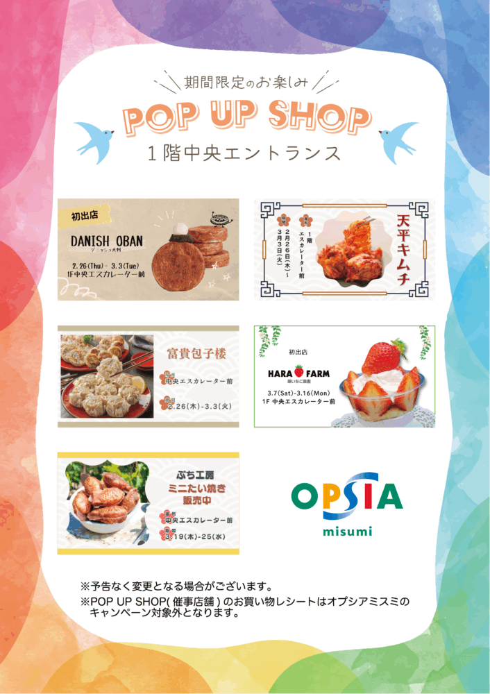 ※POP UP SHOP(催事店舗)のお買い物レシートはオプシアミスミのキャンペーン対象外となります。
