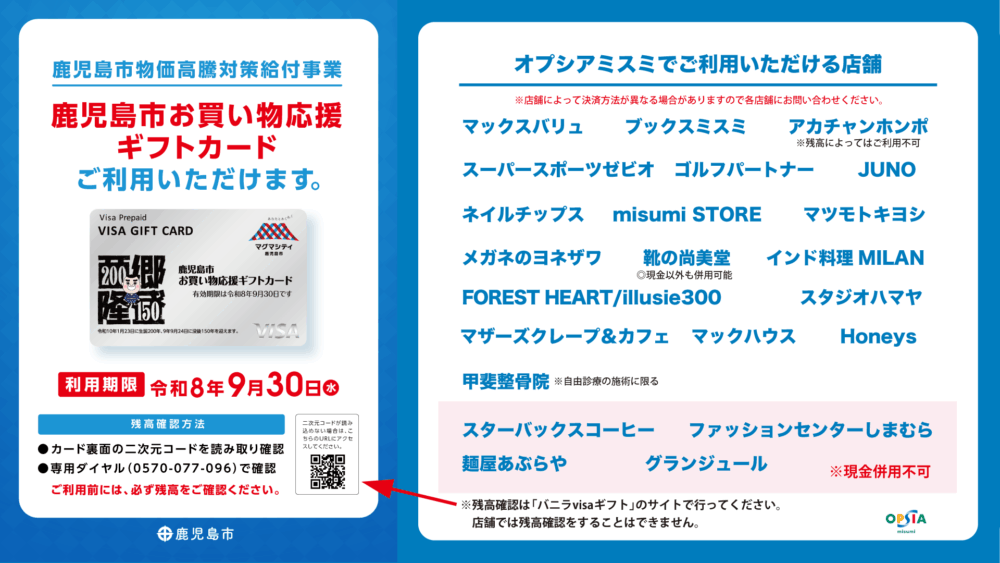 オプシアミスミ館内の対象店舗でも「鹿児島市お買い物応援ギフトカード」をご利用いただけます!