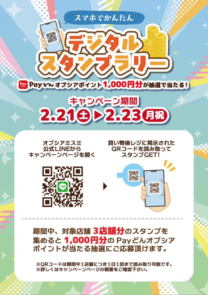 対象店舗でお買い物後、レジに設置されたQRコードをスキャン!3店舗分のスタンプを集めると、1,000円分のPayどんオプシアポイントが当たる抽選に応募可能!オプシアでお得にお買い物をお楽しみください♪